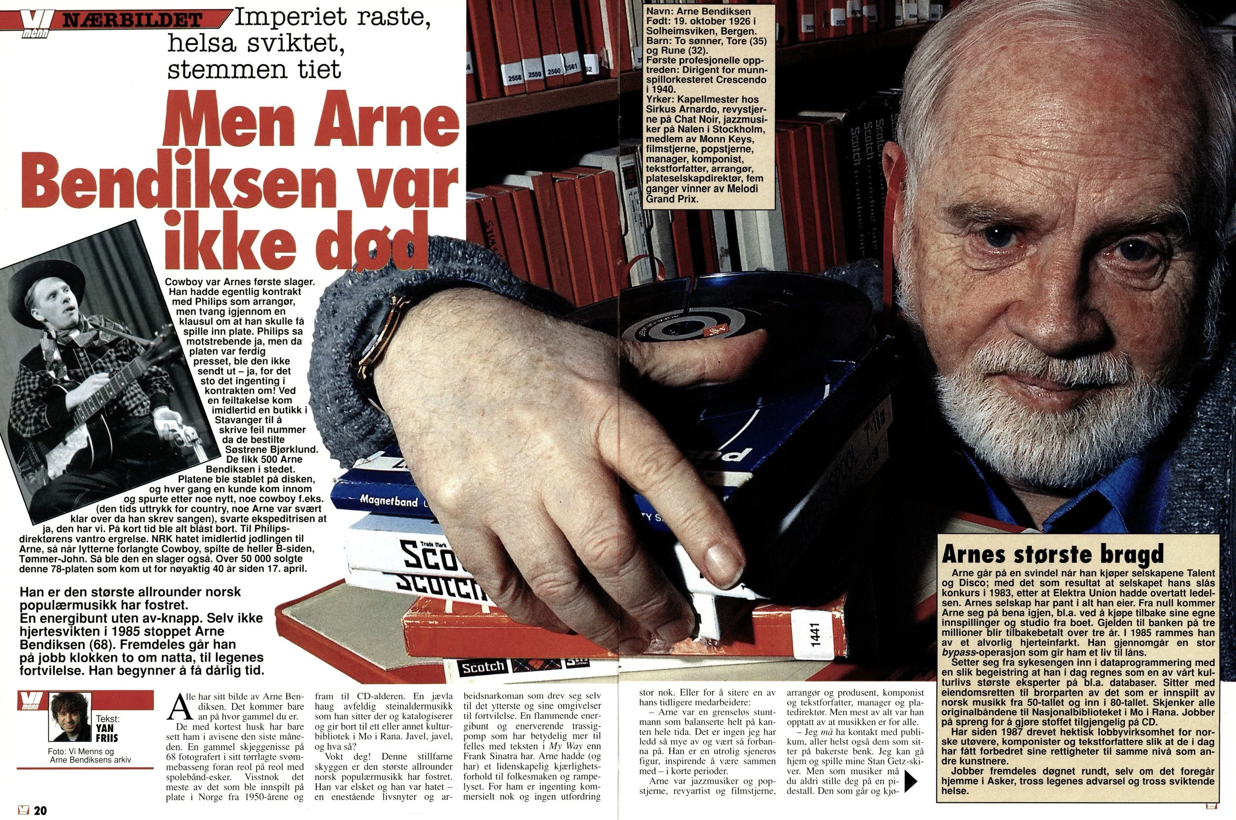 Han er den største allrounder norsk populærmusikk har fostret. En energibunt uten av-knapp. Selv ikke hjertesvikten i 1985 stoppet Arne Bendiksen (68). Fremdeles går han på jobb klokken to om natta, til legenes fortvilelse. Han begynner å få dårlig tid.