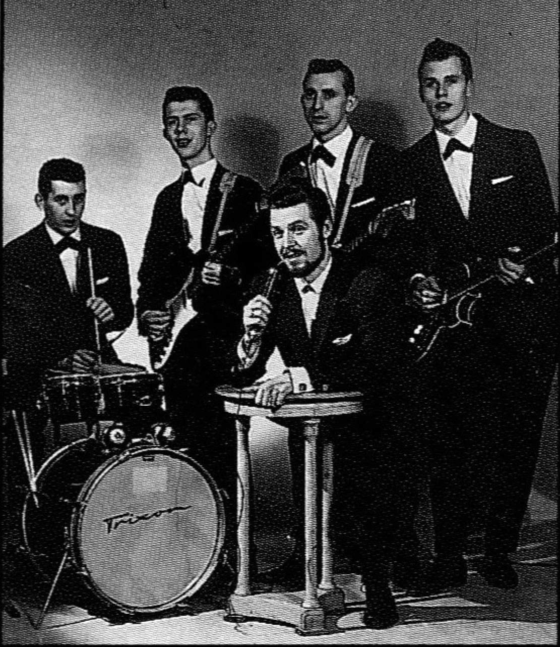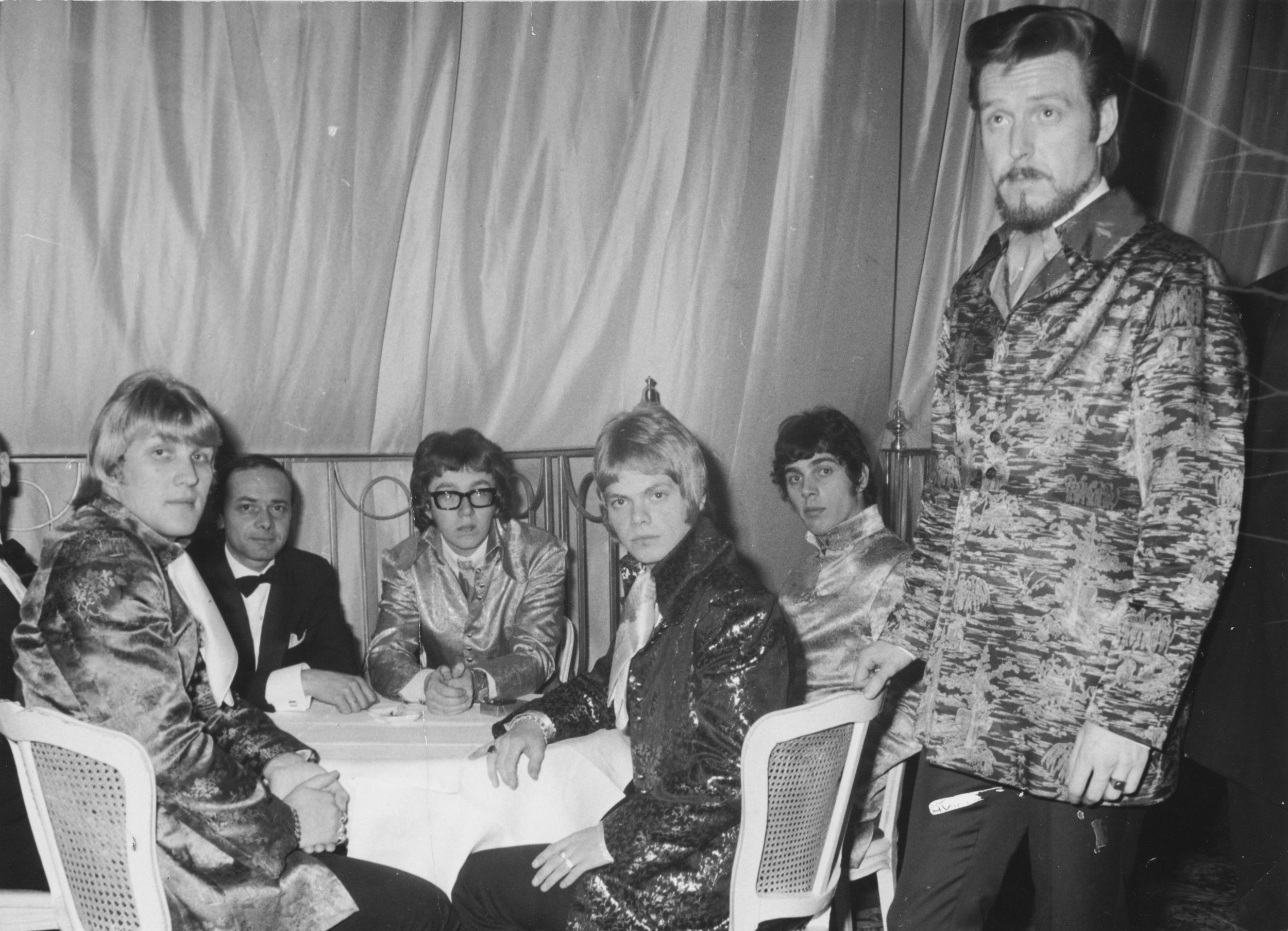 The Vanguards i Cannes; fra venstre: Bjørn Nordvang, Johnny Sareussen, Freddy Lindquist, livvakt Knut Sæther og Barry Matheson. Sistnevnte selvfølgelig poserende i forgrunnen. Sjekk for øvrig guttas silkejakker – spesial-sydd av designer Ellen Waaler! Ingen hadde hørt om Vanguards i Cannes, men Barry sørget for at de ble husket, de (inkludert Barry selv) så jo ut som en million dollars og nesten Beatles. (Foto: velvillig utlånt av Bjørn Nordvang)