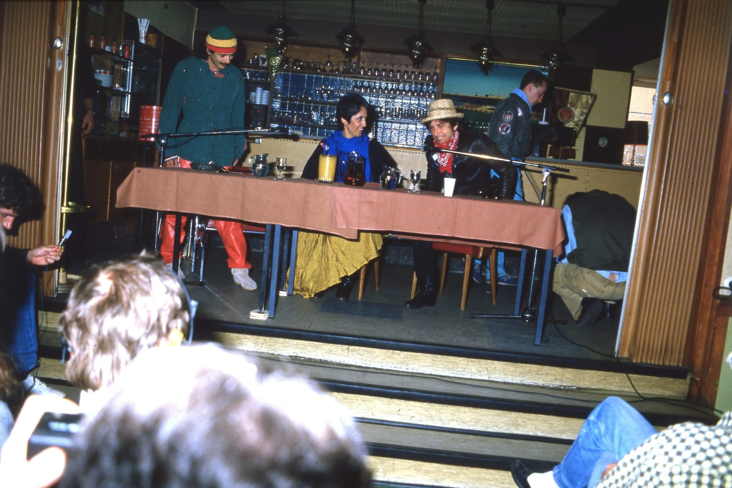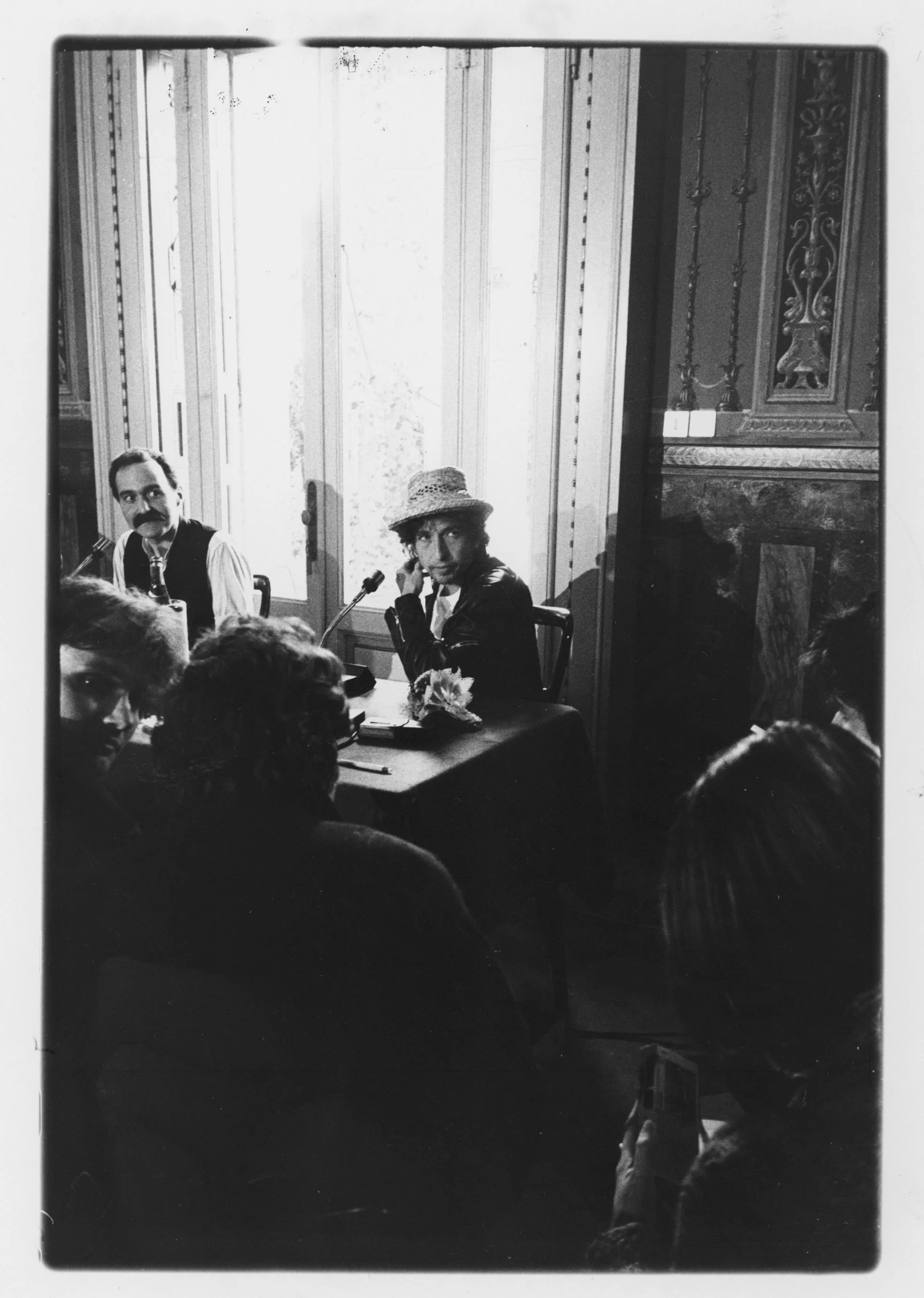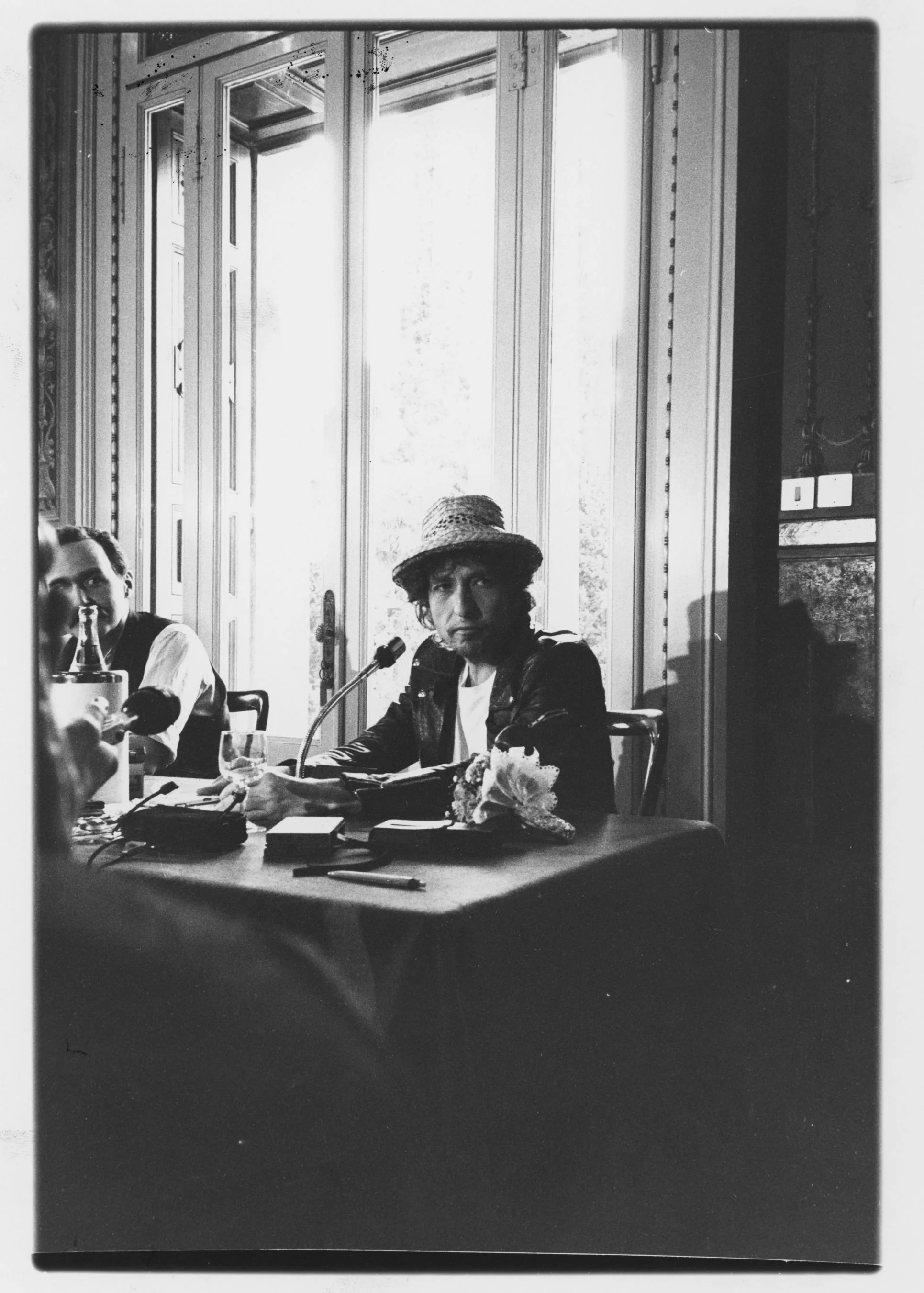 Pressekonferanse. Bob Dylan. Carlos Santana. Og i midten en italiensk tolk(!). Det måtte bli en underlig seanse. Hvert eneste spørsmål ble oversatt til italiensk før Dylan fikk svare (hvilket fjernet noe av det impulsive ved showet), og samme prosess den andre veien før neste spørsmål kunne stilles. Og der sto/satt 90 journalister brennende av iver etter å spørre, men uten ett eneste spørsmål å stille. Det ble en farse, en grunnløs kamp om ordet, tåpeligheter og spørsmål som alle visste svaret på. Mens Dylan satt uttrykksløs og trommet på mikrofonen, svarte uinteressert ut i luften og kjedet seg noe så inn i granskauen. Eneste lyspunkt var at han fikk leke med klovnene, vri på spørsmålene deres, avvæpne dem og kaste dem i papirkurven med et klask.