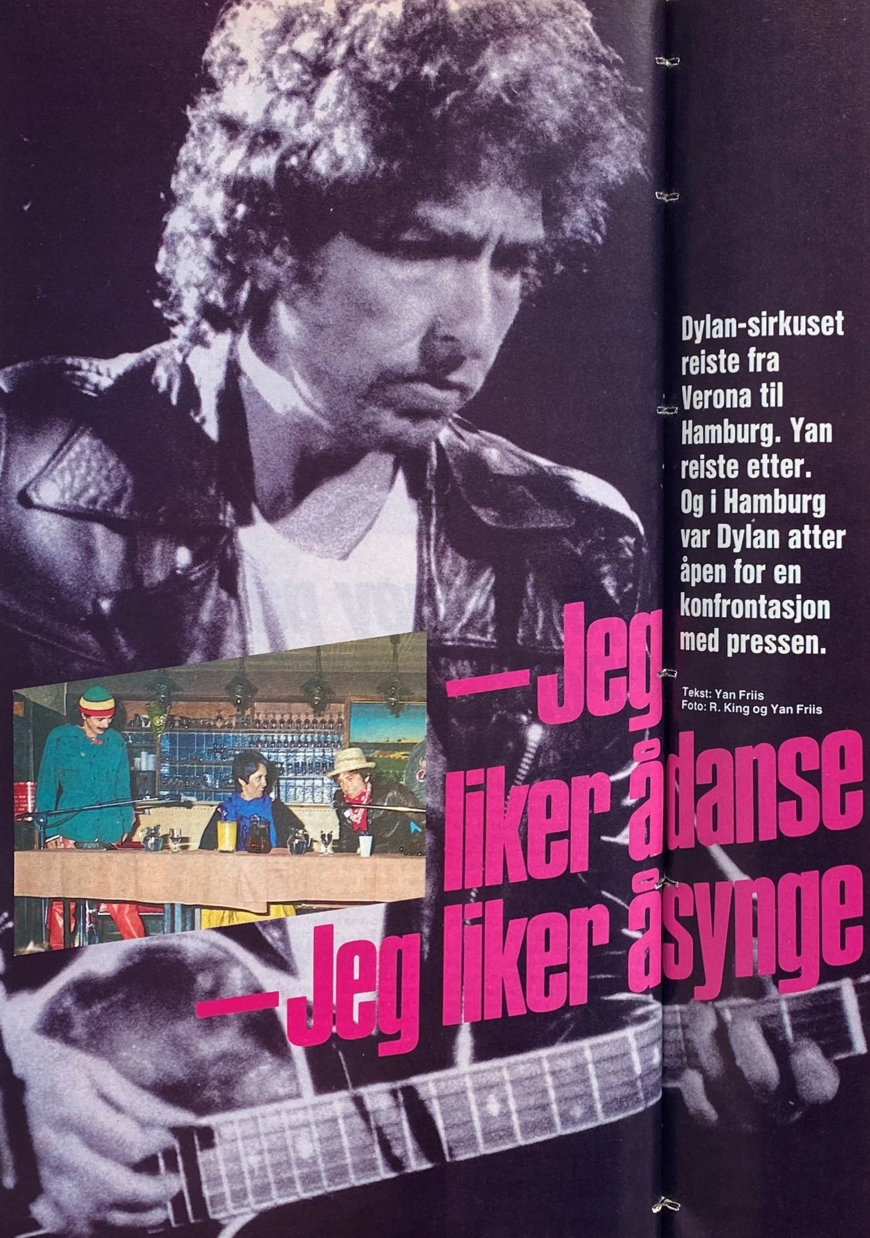 Og der sto legenden og trollbandt 51 000 sjeler (minus VGs to utsendte, de eneste i Skandinavia som skrev stygt om konserten etterpå!). Man opplevde en gjensynsglede som ikke var der i Göteborg 1978 eller Oslo 1981. 1984-konserten var et slags «ringen sluttet». En av de offisielle T-skjortene som ble solgt på området bar et kjent motiv på brystet, den smale, sinte Dylan med bassgitar-halsen som et geværløp mot kameraet, et foto fra 1965; og tvers over motivet sto det: Bringing it all back home. Nettopp! Der har du Dylan i 1984. Slik han sto på scenen i Göteborg, Verona, København . . . Det var som å se de gamle filmene av ham. Tynn som en pisk, motorsykkelstøvler, skinnjakke (vel, dressjakke i København, men, men . . .), keitete og tilgjort ustø i geberdene, bredbeint plassert bak mikrofonen med gitaren skutt inn i nevene, hodet på skakke og stemmen tynt ut til siste rasende strofe. Pluss bandet, selvfølgelig. Det minste han har hatt med seg på turné noensinne — kun gitar, keyboards, bass og trommer, alle musikere med bakgrunn i den røffe, svingende rock hvorfra alt oppsto.