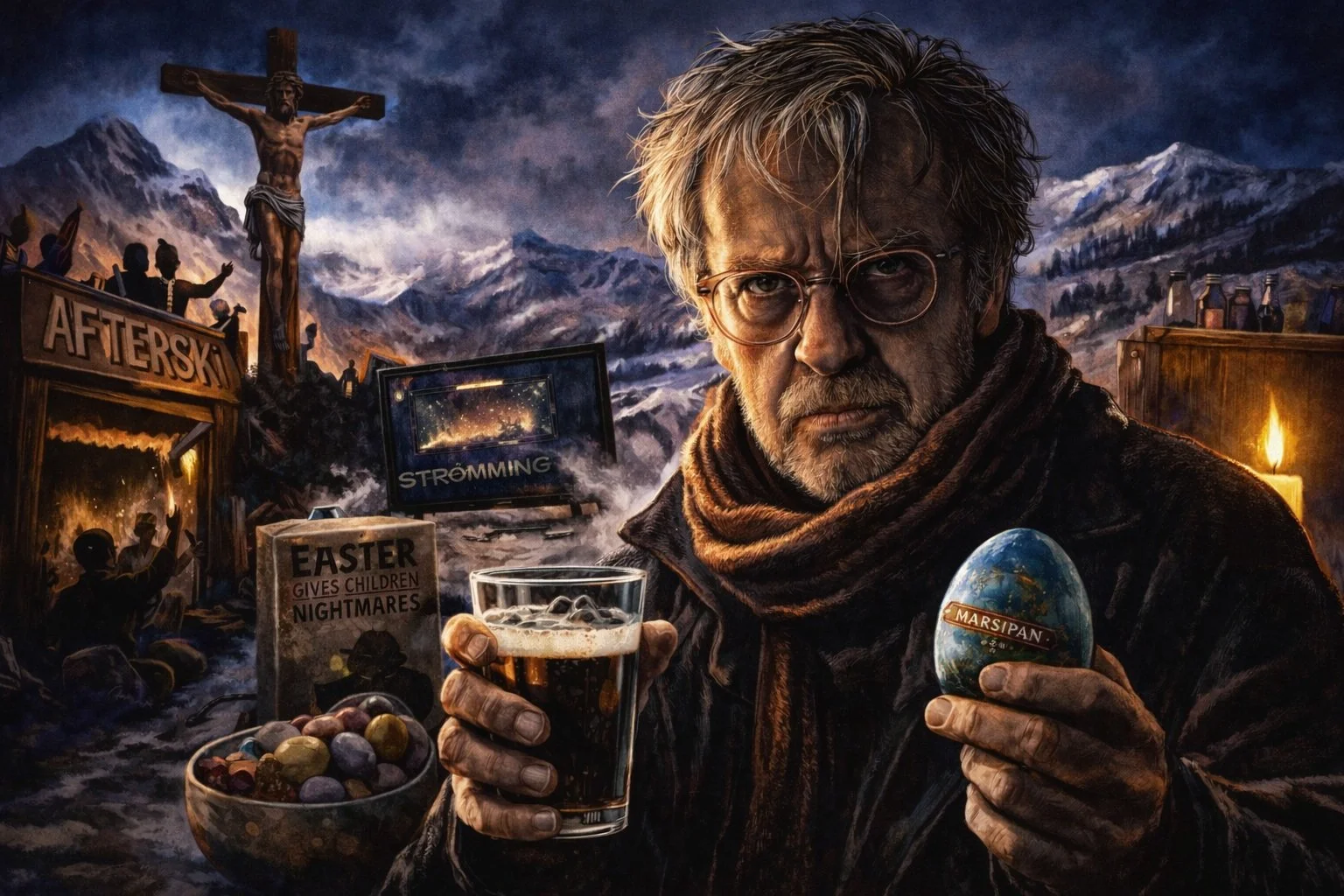 Men nå avsporer jeg. Mitt utgangspunkt var at påsken har mistet sitt innhold. For de fleste betyr påsken bare ferie. Kornet sne og is som smuldrer og sprekker. Øl i solveggen. Uteliv i bare gensere’n. After ski og los på mus. Brå behov for marsipan og egg. Bilturer med åpent vindu.