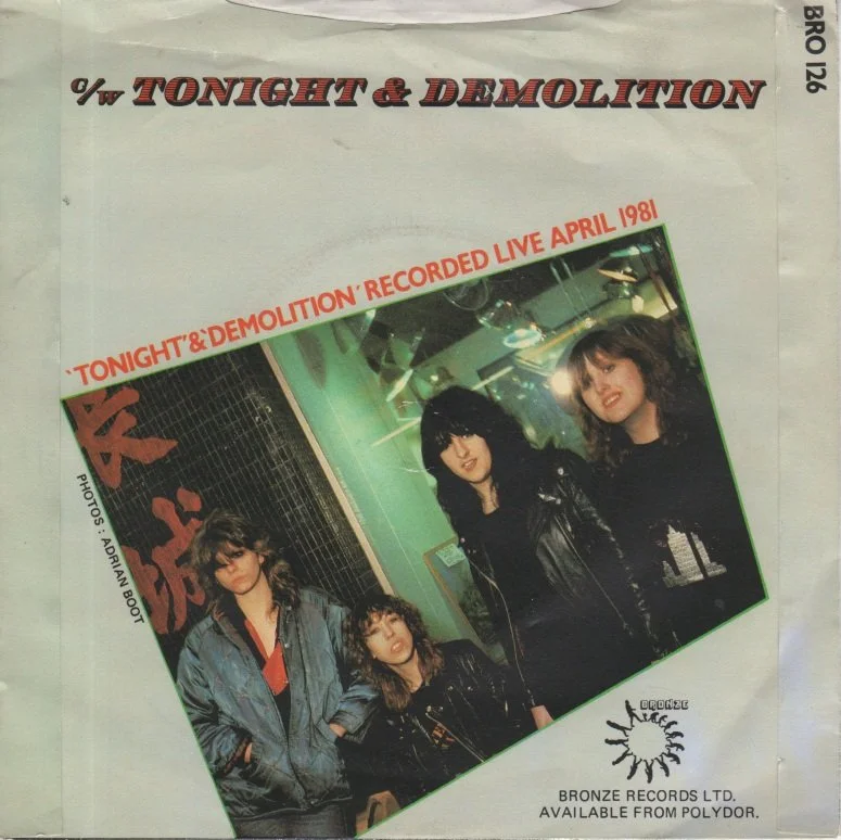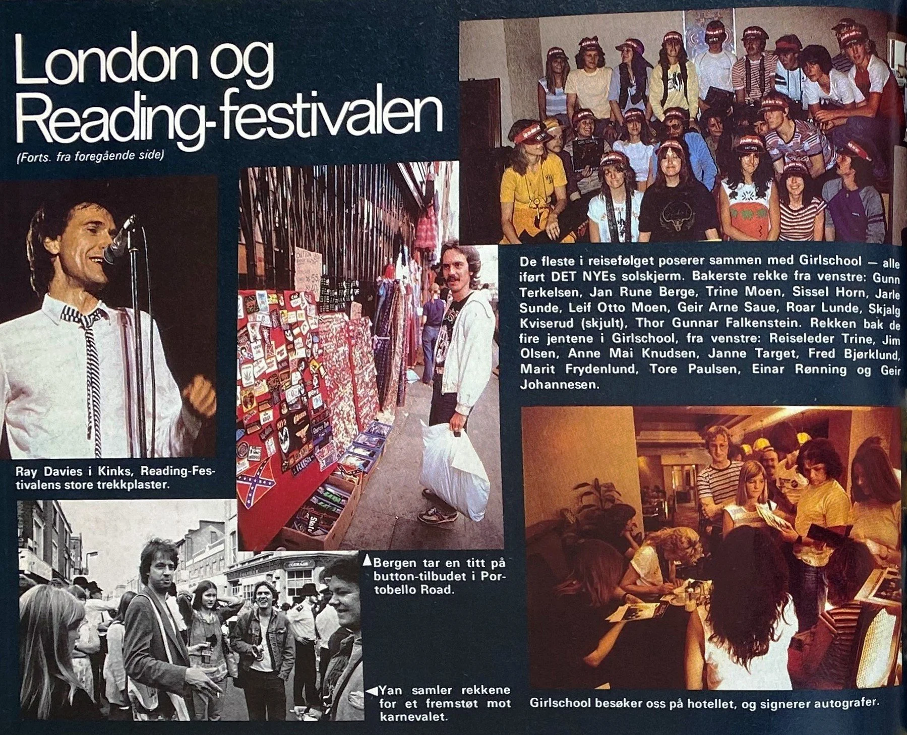 Stor glede også over en avtale DET NYE gjorde med jentegruppa Girlschool (hovedattraksjonen ved Reading-festivalens første dag). Alle fire besøkte oss på hotellet, skrev autografer, delte ut plater, bilder, poserte for amatørfotografene, og pratet med dem som hadde lyst (eller torde). De fire jentene sjarmerte faktisk så mange, at det ble nødvendig å arrangere en utflukt til Reading allerede første festival-dag (vi skulle egentlig bare være der de to siste).