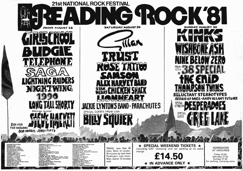 — Reading-festivalen, som den i dag heter på folkemunne, oppkalt etter stedet festivalen er blitt arrangert på de siste ni—ti årene, har i dag blitt heavy-metal-diggernes store rockehelg. — At dette skulle bli sett på som først og fremst en heavy-metal festival, er helt tilfeldig; forteller Harold Pendleton.