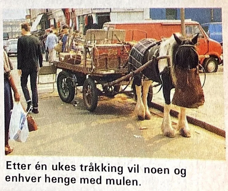 Man mettes av markedets oppstyr. Det blir rent for meget. Og jeg tror ikke noen av oss lettet noe særlig på pungen. Søstrene kjøpte noen store, tunge speilfløyelsgardiner (brukte, men i utmerket stand), det samme gjorde jeg — bitt av basillen. Bergen kjøpte plater og buttons. Inge bare vandret, og klarte det kunststykke å treffe en bekjent ... i dypet av en kjoleforretning! Selv gjorde jeg et lite fremstøt på brillefronten, forsøkte å få en brukt innfatning for 30 pence (ca. kr. 3,30), men mannen forlangte 50 pence.