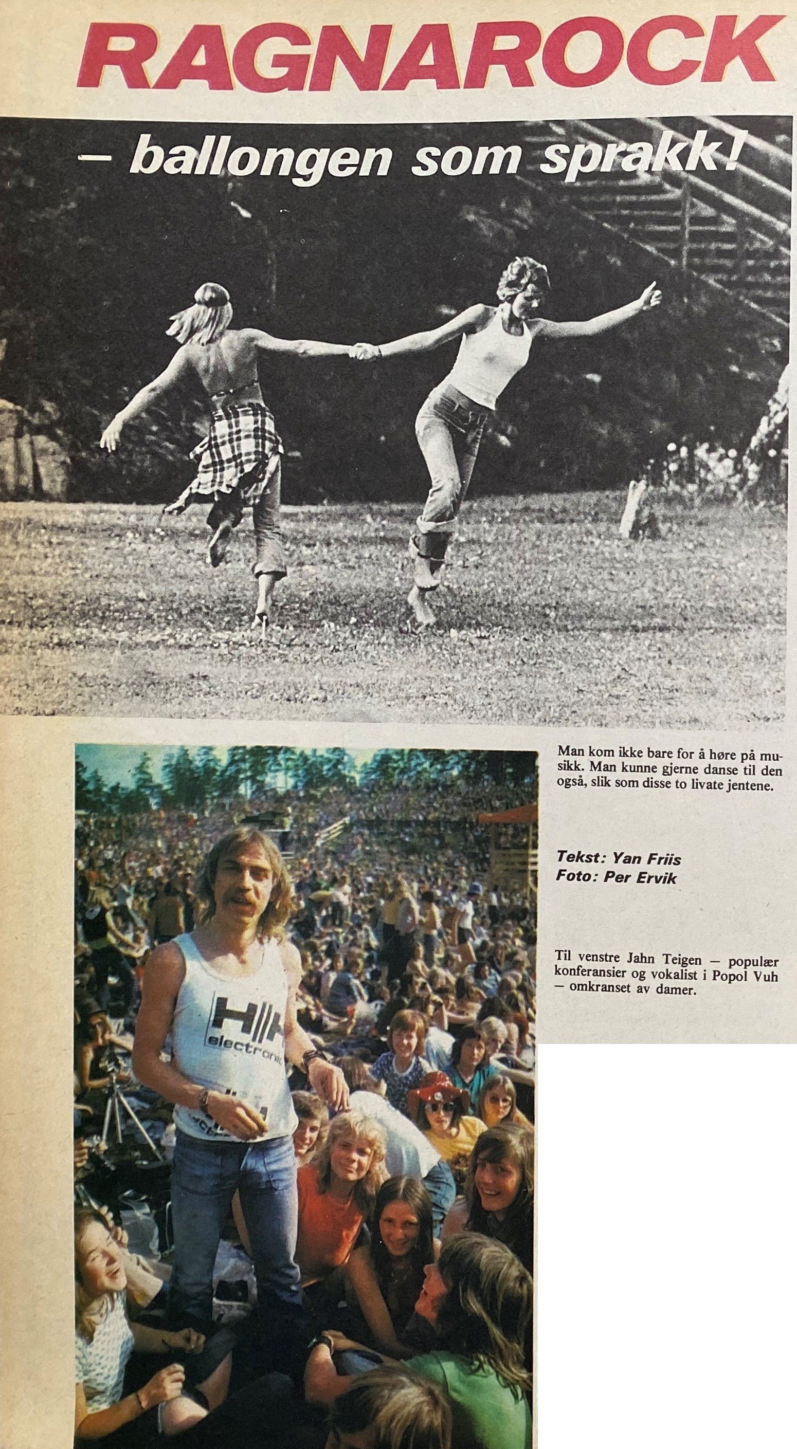 Dette var min første jobb for Det Nye, og jeg var livredd for å drite meg ut. Det gjorde ikke sakene enklere at fotografen ga fullstendig faan i hovedarrangementet søndag. Han dro på Chateau Neuf og Kroa og hygget seg, og mente det fikk holde med noen bilder fra visefestivalen på lørdag. Redaktøren ble jo fly forbannet. Jeg hadde levert en sak om Ragnarock som omtrent ikke hadde billeddekning. Ingen ting av dramaet og kaoset da alt stoppet. Ingen bilder av Alex Harvey som entret scenen fra vannet. Intet Procol Harum. Og heller ingenting av folkehavet. Bortsett fra et av Teigen.
