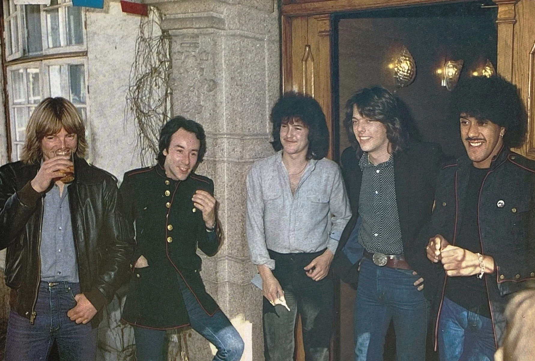 Hyggestund med Thin Lizzy utenfor Ambassadeur Hotel i februar 1981. (Foto: Svein Boye Andersen) (Fra Det Nye nr. 14 1981)