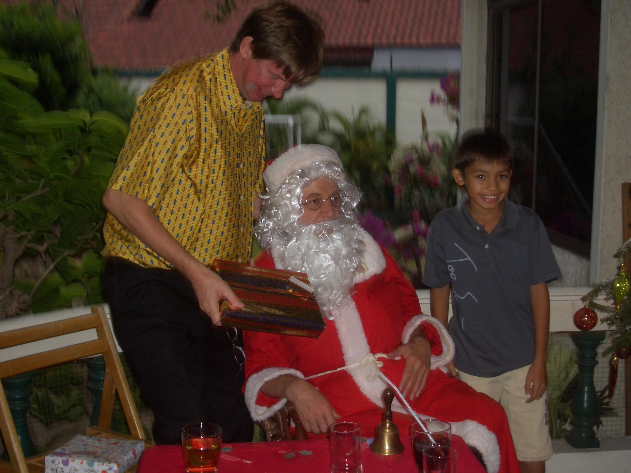 Riksjulepolitisjefen har en relativt lang fortid som deltidsjulenisse. Han skapte forventninger og glede, selv i de fjerneste av klodens hjørner. Av og til måtte han ta en pust i bakken, og da var lokalbefolkningen alltid på pletten med frisk drikke og sugerør. Her to vennlige krabater fra Jomtien i Thailand, la oss kalle dem Jan-Olav og Matthew. Det antas at fotografiet er fra 2004.