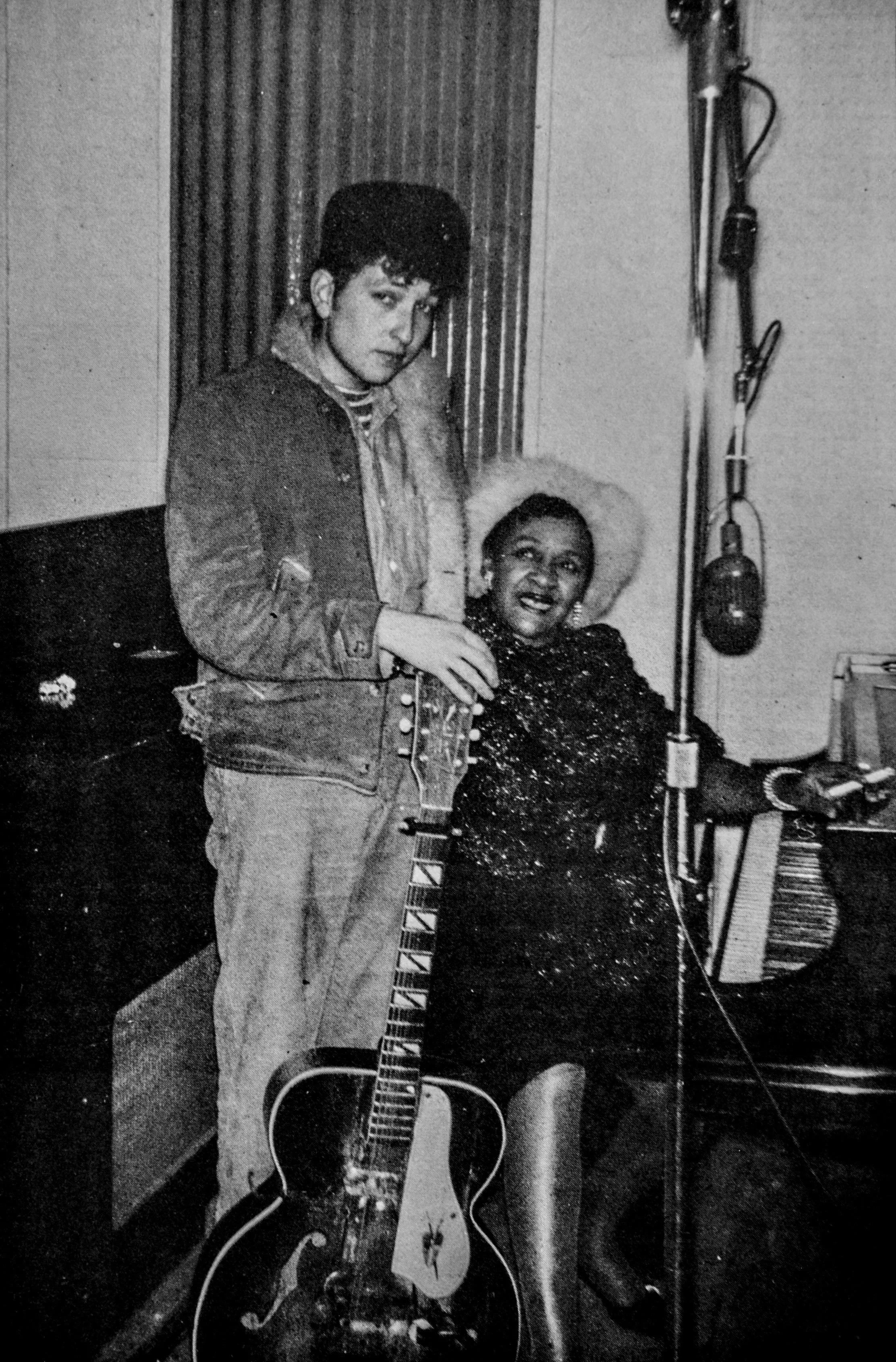 Dylans bidrag på Victoria Spiveys “Three Kings And The Queen” er han stolt over den dag i dag. Foto fra studio i 1961. (Foto: Reddit)