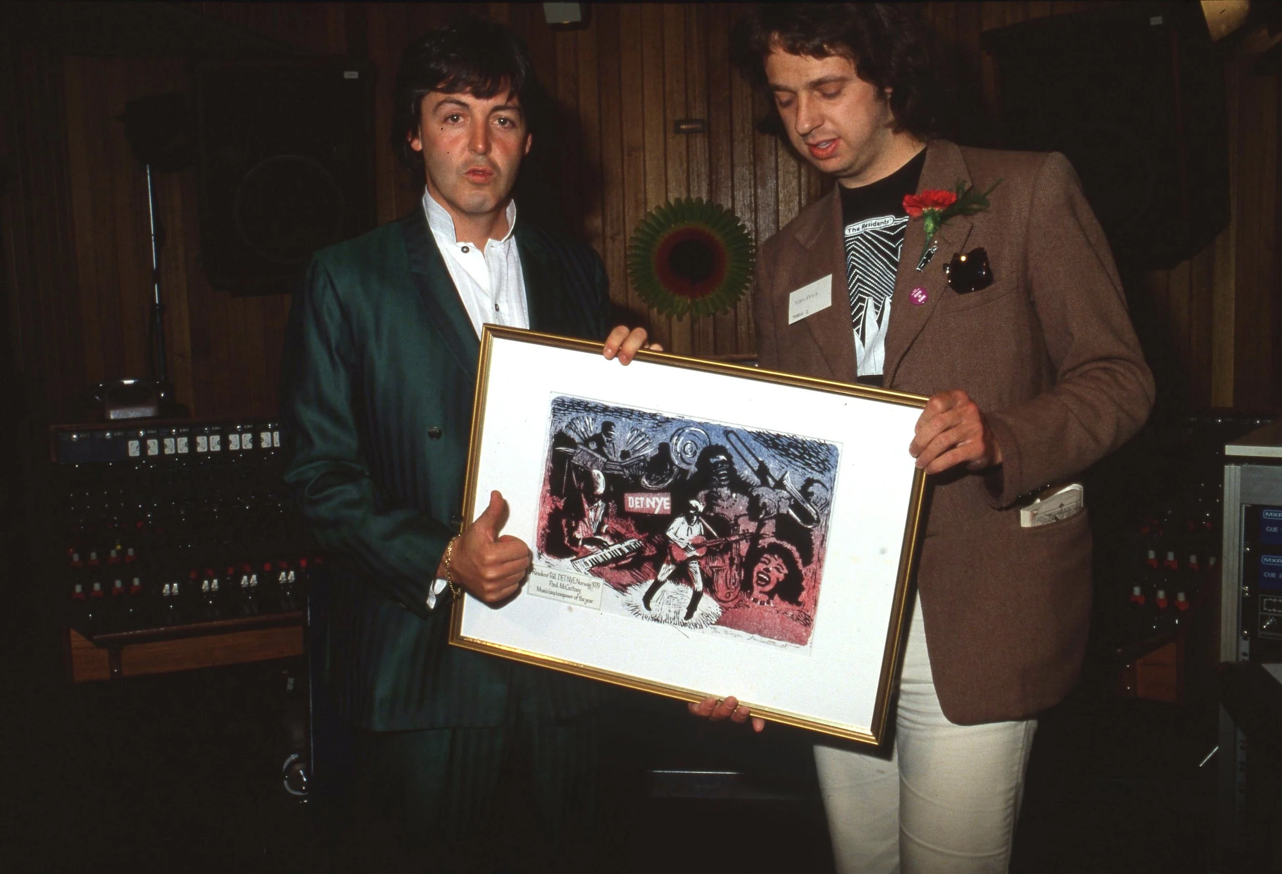 Og før han smatt ut døren fikk vi overrakt Paul et par eldgamle diplomer fra DET NYEs leseravstemninger i 1982 og 1983 den gang «Tug Of War» ble valgt til årets LP og Paul McCartney til årets musiker/komponist. Den evige gentleman strålte som en sol, selvfølgelige, og smilte enda bredere da vi ga ham en hilsen fra våre lesere i anledning «Flowers In The Dirt» også.