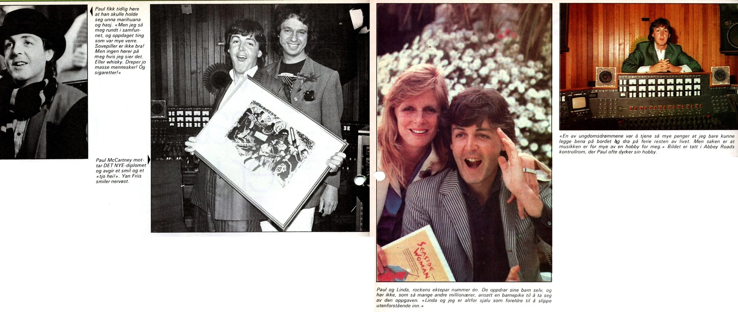 Tidligere i år kåret DET NYEs lesere Paul McCartney til «årets musiker/komponist». Det var hans tredje seier på rad i denne musikkavstemningen. Nylig dro vi til London for å overrekke ham DET NYE-diplomet, og møtte en svært opplagt Paul McCartney. Han snakket fritt om sitt fengselsopphold i Japan, om narkotika, penger, familie og musikkarriere. Noen mener kanskje at han er litt for åpen, men som Paul sier: «Man kan da ikke forlange at jeg skal lyve!»