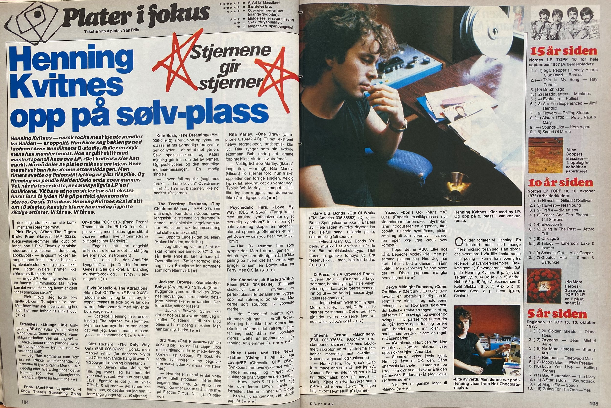 Denne gangen er det Eigil Bergs tur. Seansen foregikk klokken 10 om formiddagen/morgenen, bak nedtrukne persienner som holdt det strålende, skarpe sollyset ute. Kaffekoppene røk, våre øyne var smale — og atmosfæren var så fjernt fra diskotekenes pop-lykkeland som vel mulig. Følgelig virket de 21 singlenes gjennomgående danse-beat malplassert, og det falt både Eigil og undertegnede tungt å kryste fram den store entusiasmen. Men her følger nå resultatet. Alle kommentarer i parentes står for min regning.